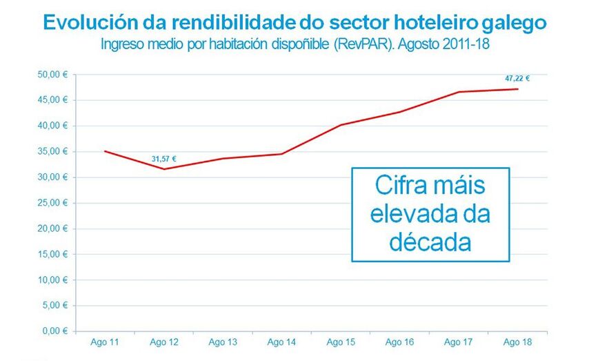 En concreto, o sector hoteleiro galego viu melloradas un 3,7% as súas tarifas no oitavo mes do ano de acordo cos datos difundidos hoxe polo Instituto Nacional de Estatística (INE). Este feito, unido a diversos aspectos, permitiu que os empresarios optimizaran a súa rendibilidade medida a través do RevPAR, ingreso medio por habitación dispoñible. Este parámetro subiu un 1,3% ata a cifra máis alta da década contribuíndo a un turismo de maior calidade.