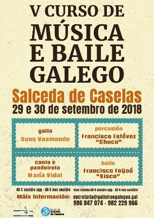 Os vindeiros dias 29 e 30 de setembro, o Concello de Salceda de Caselas acollerá o V CURSO DE MÚSICA E BAILE GALEGO. Esta edición, organizada pola Asociación de Gaiteir@s Galeg@s en colaboración co concello, contará con catro especialidades: Percusión tradicional, impartido por Francisco Estévez “Chuco”, gaita, impartido por Suso Vaamonde, canto e pandeireta, impartido por María Vidal e baile tradicional, impartido por Francisco Feijoó “Xisco”.