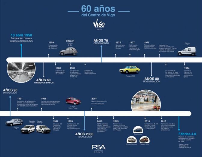 Hace más de 60 años, Vigo hizo valer sus ventajas técnicas y geográficas ante Cádiz y Barcelona para acoger una nueva fábrica de automóviles de una conocida marca francesa. Citroën se decantó por la alternativa gallega debido a tres motivos: la existencia de la Zona Franca, un factor clave para la idea inicial de exportar furgonetas 2 CV a Marruecos; por el acceso a un puerto de primer nivel que permitía una conexión rápida con Francia y por la disponibilidad de una mano de obra cualificada, debido a la fuerza de la industria naval y a dos instituciones educativas prestigiosas: la Escuela de Artes y Oficios, abierta en 1886, y la Escuela de Ingeniería Industrial, fundada en 1901. El 10 de abril de 1958 coincidieron la colocación de la primera piedra de lo que es hoy el Centro de Producción de Groupe PSA en Vigo con la producción del primer Citroën AZU con rumbo a Marruecos. Todo lo demás es historia.