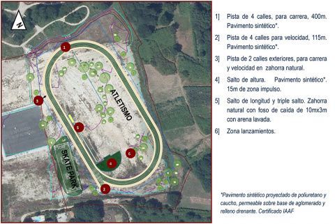 A pista de atletismo, a primeira en Nigrán, contará con catro rúas para competir en carreiras de 400 metros e tamén estará habilitada para as probas de velocidade con 115 metros, a superficie será de pavimento sintético de poliuretano e caucho, permeable sobre base de aglomerado e recheo drenante. A maiores, a instalación contará con dúas rúas exteriores en balastro natural para velocidade e carreira e, no interior, salto de altura con 15 metros de zona de impulso en pavimento sintético; salto de lonxitude e triple salto con balastro natural e foso de caída en area de 10x3 metros e, finalmente, terá zona de lanzamentos. Prácticamente anexa, nun espazo de 53x16 metros, estará o skate park con diferentes elementos para os skaters (en concreto, terá wave, quarter, wave invertido, funbox e spine). Toda a nova instalación deportiva estará nun recinto pechado con iluminación artificial e ao seu carón (tamén a piques de comezar a obra contemplada no mesmo proxecto) haberá unha zona de recreo infantil e familiar con elementos de recreo como columpios, tirolina, circuito de bicicletas BMX….