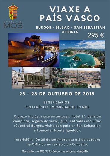 Dende a concellería de Participación Cidadá que dirixe a edil Julia Loureiro infórmase de que o vindeiro luns, 8 de outubro, será o último día para inscribirse na excursión ao País Vasco que se organiza dende este departamento municipal e na que os participantes poderán visitar Burgos, Bilbao, San Sebastián e Vitoria.