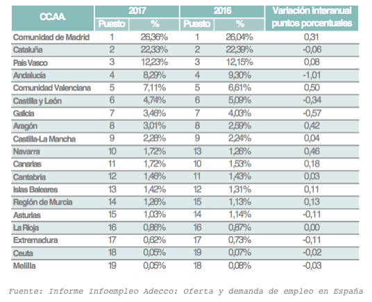 La Comunidad de Madrid mantiene su liderazgo como principal generadora de oferta de empleo en España, acaparando el 26,36% de la oferta total, tres décimas más que el año anterior. Le siguen Cataluña y País Vasco, que se mantienen estables y suman el 22,33% y el 12,23% del conjunto de oferta, respectivamente.