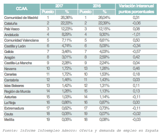 La Comunidad de Madrid mantiene su liderazgo como principal generadora de oferta de empleo en España, acaparando el 26,36% de la oferta total, tres décimas más que el año anterior. Le siguen Cataluña y País Vasco, que se mantienen estables y suman el 22,33% y el 12,23% del conjunto de oferta, respectivamente.