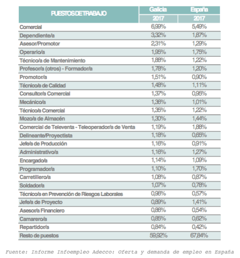Entre los diez puestos de trabajo más demandados en Galicia se encuentran también los de técnico de calidad (1,5%), consultor comercial (1,4%) y mecánico (1,4%).