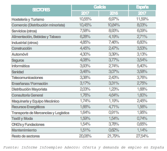 Construcción (4,5%), el sector del automóvil (4,3%), los seguros (4,1%), la informática (3,9%), la sanidad (3,5%), las telecomunicaciones (3,4%), la enseñanza (3,2%) y el de distribución mayorista (2%) son los otros sectores que más ofertas de empleo publican en Galicia.