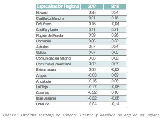 Por el contrario, las autonomías con menor especialización y, por tanto, mayor dispersión sectorial de sus ofertas de empleo son Cataluña (-0,24), Baleares (-0,22) y Canarias (-0,22).