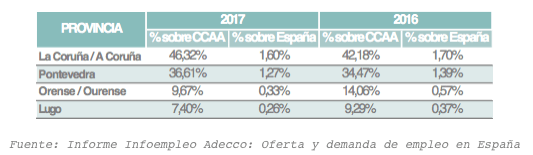 Si nos centramos en Galicia, A Coruña, con un 46,3% de la oferta, y Pontevedra, con un 36,6%, aglutinan 8 de cada 10 ofertas de empleo en la autonomía, lo que evidencia la elevada concentración en la zona. De hecho, la tendencia indica una concentración creciente, pues el peso de las ofertas de empleo de estas provincias ha crecido notablemente en el último año. Por el contrario, se ha reducido la proporción en las provincias de Ourense, que suma el 9,7%, y Lugo, con el 7,4%.