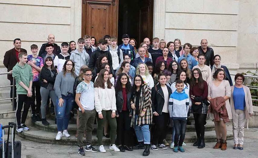 O Alcalde de Ponteareas acompañado da concelleira de Mocidade Verónica Carrera, da de Cultura Hortensia Bautista e do concelleiro de Servizos Sociais Manolo Tronocoso , recibiron aos quince alumnos irlandeses procedentes do Centro Archbishop McHale College de Tuam, en Galway, que participan co alumnado ponteareán no proxecto Erasmus + "Endangered languages, cultural diversity and integration in the EU of the 21st century", de financiación europea.
