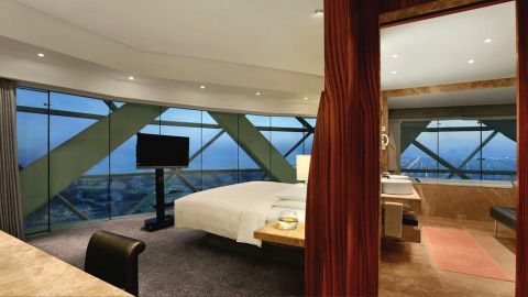 El Hotel Hyatt Capital Gate de Abu Dabi es el hotel más inclinado del mundo, está situado entre las plantas 18 y 33 de la torre Capital Gate, de 165 metros de altura, que tiene una inclinación de 18 grados, ¡cuatro veces superior a la Torre de Pisa!. El hotel, de 5 estrellas, cuenta con 189 habitaciones y suites, piscina al aire libre, gimnasio, piscinas de hidromasaje suspendidas y su famoso spa conocido como “spa cielo” por sus increíbles vistas a la ciudad.
