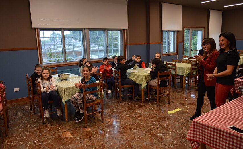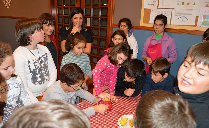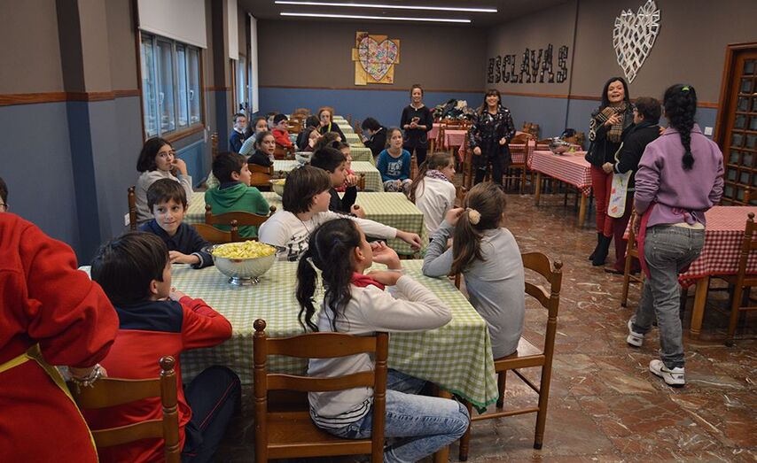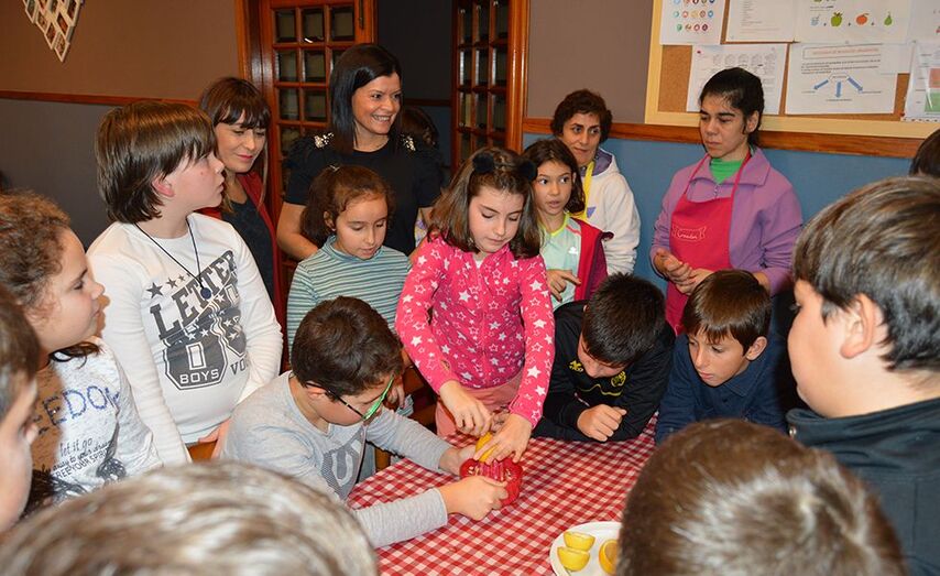Usuarias de EVD Galicia, Escravas da Virxe Dolorosa, ensinan a escolares mosenses a elaborar marmeladas nas instalacións do seu centro en Petelos para conmemorar esta data
