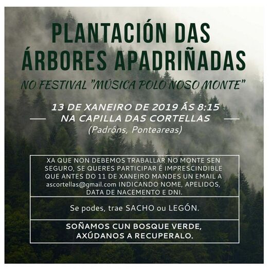 A veciñanza das Cortellas e a comunidade de montes de Padróns convida a todas as madriñas e padriños que apadriñaron árbores no festival “Música polo noso monte” celebrado o pasado 3 de marzo de 2018 a participar na xuntanza que terá lugar este domingo 13 de Xaneiro ás 08:15 horas.