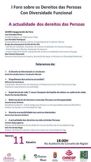 O Concello de Nigrán ofrece este venres 11 de xaneiro dende as 18:00 horas no Auditorio Municipal o “I Foro sobre os Dereitos das persoas con diversidade funcional”, xornada que se enmarca no programa “Un Nigrán para todos”. Deste xeito, expertos en todos os campos da integración e da accesibilidade analizarán polo miudo , e entre outros aspectos, a aprobación polo Congreso e o Senado o pasado mes de decembro da modificación da Lei Orgánica do Réxime Electoral Xeral (LOREG) que garantizará o dereito de sufraxio das persoas con discapacidade (na práctica supón que máis de 100.000 persoas en toda España con discapacidade recuperan seu dereito ao voto).