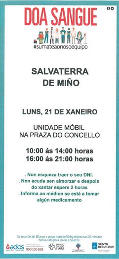 NDende o Concello de Salvaterra de Miño convidan a toda a cidadanía a achegarse no transcurso do vindeiro día luns 21 de xaneiro a doar sangue nestes vehículos, xa que todos os días do ano precísanse entre 400 e 500 doazóns de sangue para cubrir axeitadamente todas as necesidades de compoñentes sanguíneos dos nosos centros sanitarios.
