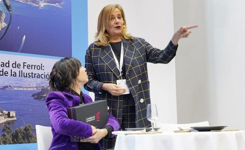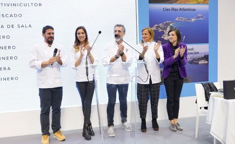 As tres Estrelas Michelin Amaranta, Pepe Solla e Javi Estévez, acompañados da presidenta Carmela Silva e da actriz Deborah Vukusic, converteron o stand de Fitur nun escenario teatral en clave de humor para enxalzar a enogastronomía da provincia