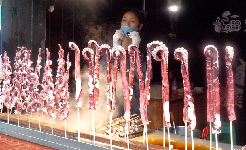 Otro de sus “entretenimientos” es comer, porque la ciudad debe ostentar el record del mayor número de restaurantes por habitante y siempre parecen estar llenos. Además hay miles de puestos que ofrecen sus comidas en la calle por unos pocos yuanes. Abundan los pinchos de distintos sabores que se ofrecen por docenas dentro de un vaso de cartón. Hay especialidades para cada gusto que hay que buscar porque no son habituales: patas y crestas de gallina, balut, un huevo a medio hacer con el feto dentro, saltamontes, arañas y otros insectos fritos, camarones borrachos crudos, cerebros de cerdo, escorpión, abejas y hay un restaurante que propone como plato estrella penes y testículos de diversos animales.