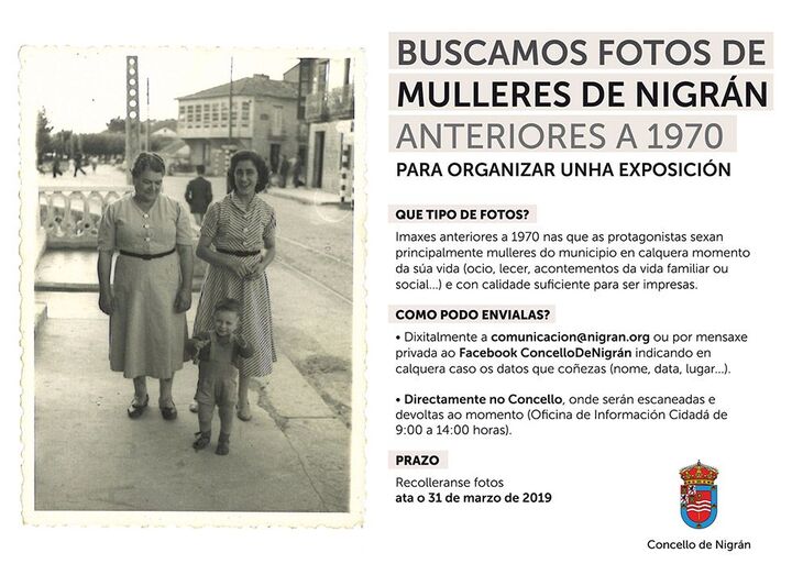 O Concello de Nigrán arranca xa a súa programación especial do 8 de marzo facendo un chamamento á veciñanza para que envíe fotos ao consistorio anteriores a 1970 nas que as protagonistas sexan mulleres do municipio. O obxectivo do goberno local é visibilizar e por en valor o papel esencial da muller de Nigrán organizando posteriormente unha exposición con todo o material recompilado. O único requirimento é que sexan fotos de mulleres de Nigrán, anteriores a 1970, e que a muller sexa a protagonista (traballando, en momentos de ocio ou lecer, coa familia, amigas... en calquera faceta). As imaxes poden enviarse por mensaxe privada ao facebook ConcelloDeNigrán ou ao correo comunicacion@nigran.org indicando os datos de que se dispoñan (nome da muller/es, data e lugar da foto e actividade que está a realizar) ou ben acudindo coa mesma á Oficina de Información Cidadá do Concello de Nigrán (de 9:00 a 14:00 horas) para que sexa escaneada e entregada ao propietario no momento.