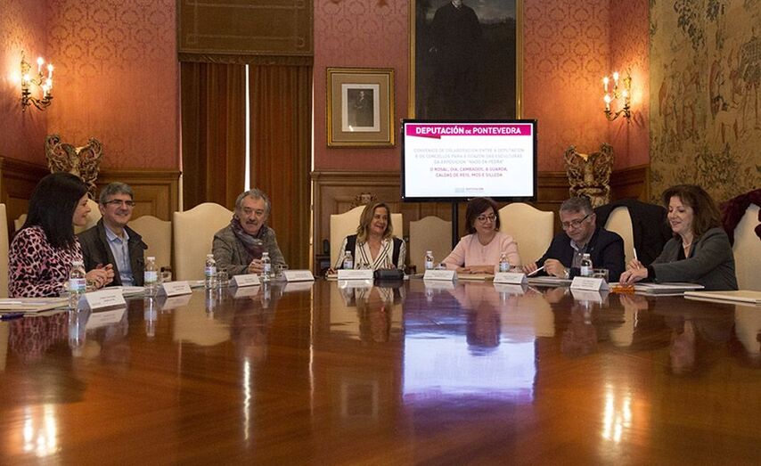 A presidenta da Deputación de Pontevedra, Carmela Silva, asinou esta mañá, no Pazo Provincial, cos concellos de O Rosal, Oia, Cambados, A Guarda, Caldas de Reis, Mos e Silleda, o convenio para a doazón das esculturas da exposición “Nado en Pedra” da Escola de Cantería da Deputación de Pontevedra. Xunto á presidenta Carmela Silva e a deputada provincial Montse Magallanes, estiveron a tenente de alcalde de O Rosal, Charo Tabales; o alcalde de A Guarda, Antonio Lomba; o alcalde de Caldas de Reis, Juan Manuel Rey; a alcaldesa de Mos, Nidia Arévalo; e o alcalde de Silleda, Manuel Cuiña.