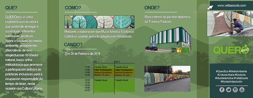 ‘QUEROeco’, é unha experiencia innovadora que pretende achegar á xuventude, diferentes mensaxes positivas sobre o coidado do medio ambiente, propoñendo alternativas de lecer respectuosas co medio natural (Cultura Urbana), baixo unha metodoloxía que promove prácticas inclusivas e responsables para a ocupación do tempo de lecer.