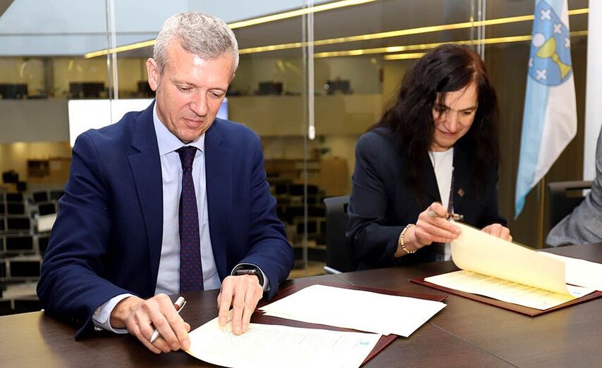 O vicepresidente da Xunta, Alfonso Rueda, e a decana do Colexio Oficial de Psicoloxía de Galicia, Rosa Álvarez, asinaron onte un convenio neste sentido