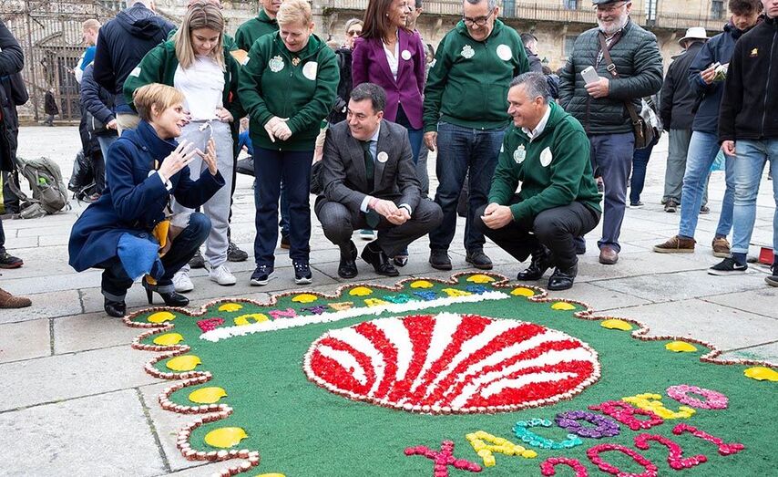 O conselleiro de Cultura e Turismo, Román Rodríguez, acompañado da directora da Axencia Turismo de Galicia, Nava Castro, asistiu a semana pasada na praza do Obradoiro á recreación dunha alfombra floral co logo do Xacobeo 21. Trátase dun adianto da monumental alfombra que os membros da Asociación de Alfombristas de Ponteareas realizarán na Grand Place de Bruxelas para anunciar a celebración do vindeiro Ano Santo.