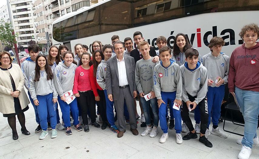 O alcalde achegouse este luns ata o céntrico colexio, onde estudantes de 3º de ESO promoven unha acción solidaria e de concienciación para animar á cidadanía a doar sangue. Organizado xunto a ADOS -a Asociación de Doazón de Órganos e Sangue-, o camión está emprazado este luns na rúa Venezuela.