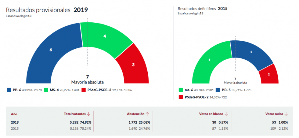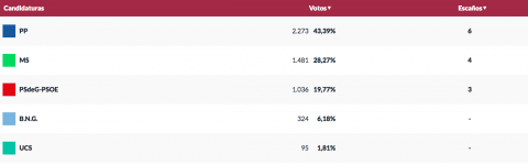 El PP es la fuerza más votada y consigue seis concejales, MS pierde un edil quedando con 5 y el PSdeG PSOE mantiene sus dos concejales