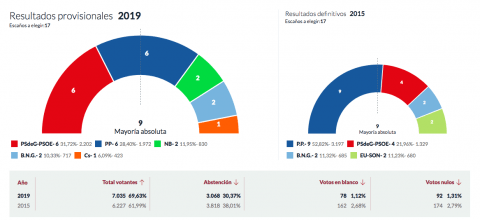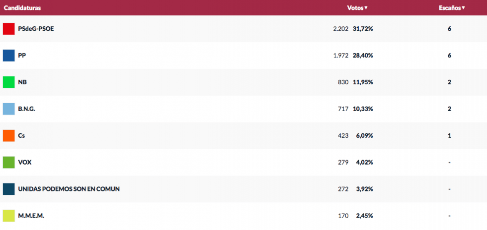 El PSdeG-PSOE (6) gana las elecciones en Baiona con 2202 votos, el PP (6) segunda fuerza con 1972 votos y NB (2) , BNG (2) y Cs (1)