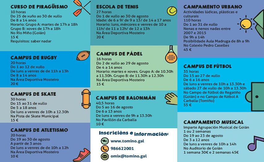 O prazo de inscrición remata o día 25 de xuño (o 24 no caso de piragüismo). O trámite pode realizarse a través da páxina web do Concello, no seguinte enlace: https://tomino.gal/campamentos-de-veran-2019/.