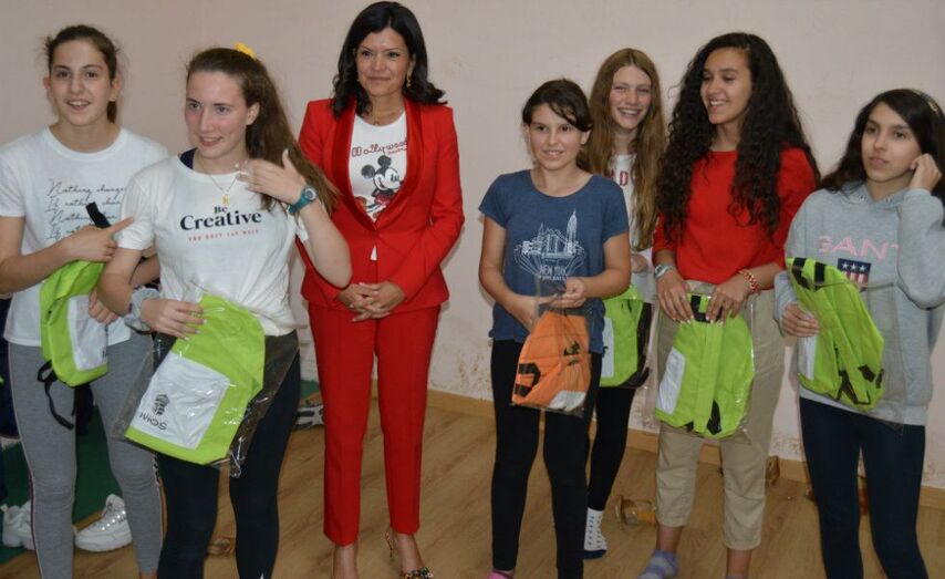 Nidia Arévalo e o concelleiro de Deportes en funcións, Baldomero Lorenzo, visitaron esta tarde no Pavillón Óscar Pereiro ás bailarinas adestradas pola mosense Patricia Martínez