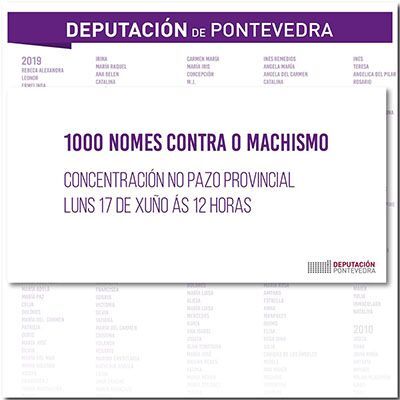 A presidenta da Deputación de Pontevedra, Carmela Silva, confirmou esta semana que será o vindeiro luns, día 17, cando se descolguen as dúas grandes lonas cos nomes das 1.000 mulleres asasinadas polas violencias machista dende o 2003, ano no que comezaron a existir estatísticas. O acto, que está programado para as 12:00 horas, “será unha acción activa e colectiva contra a violencia de xénero que asasina ás mulleres cuxos nomes non poden caer no esquecemento ante unha situación tan grave e dramática”.