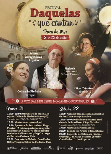 Este venres e sábado (21 e 22 de xuño) terá lugar no Pazo de Mos o I Festival Daquelas que Cantan. A Voz das mulleres no Camiño Portugués, que estará protagonizado por cantoras do talle de Celina da Piedade (Portugal), Kátya Teixeira (Brasil), o grupo Malvela, Uxía, Arume, Zaragateiras e Ergutío.