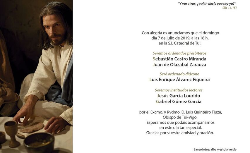 Además, también se invita a acompañar a los nuevos presbíteros en sus primeras Misas, el domingo 14 de julio a las 18h en la parroquia de San José Obrero y Santa Rita (D. Juan), y el 28 de julio a las 18h en San Lourenzo de Fornelos de Montes (D. Sebastián).