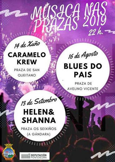 Música nas Prazas 2019 chega o vindeiro venres día 13 de setembro ao seu fin tralos concertos de Caramelo Krew o 14 de xuño na Praza de San Queitano e de Blues do País o pasado venres día 16 de agosto na Praza de Avelino Vicente(As de Copas).
