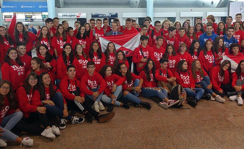 Abel Caballero despediu esta semana no aeroporto de Vigo a preto de dous centenares de estudantes vigueses que viaxaban ao Reino Unido para gozar da bolsa municipal de inmersión lingüística, un programa ao que o Concello dedica 2,2 millóns de euros