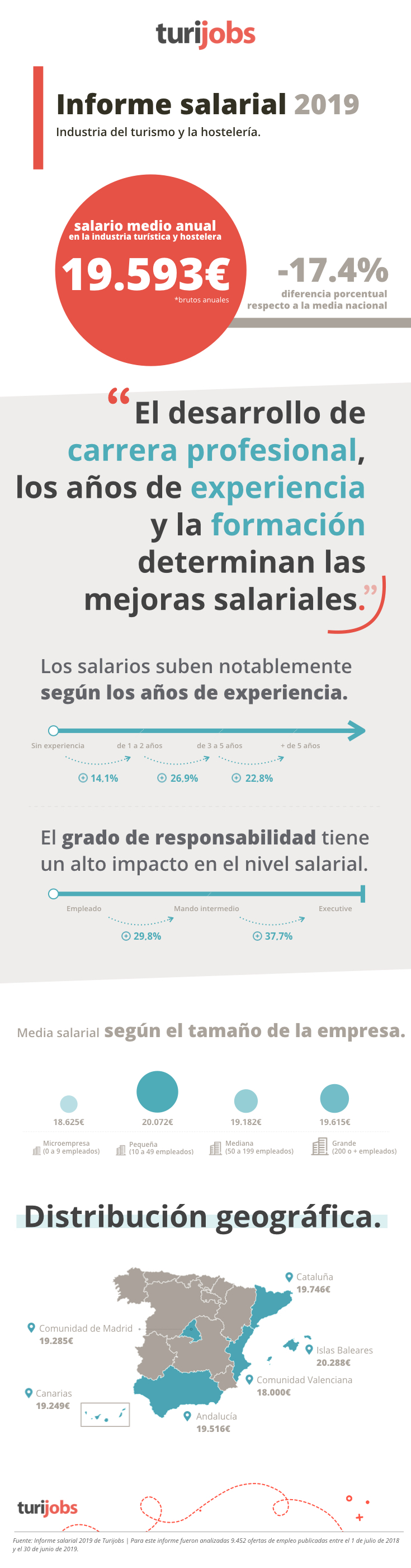 Es considerado que los salarios en turismo y hostelería se encuentran entre los más bajos cuando se comparan con los de otras industrias. El portal de empleo hace un análisis de esta realidad de forma exhaustiva, objetiva y detallada, para ofrecer una visión real de las condiciones salariales en turismo y hostelería. Analizando más de 9.000 ofertas laborales de la industria en España y Andorra del último año, los datos muestran como existen oportunidades de carrera, donde el desarrollo salarial está directamente relacionado con la experiencia y la formación.
