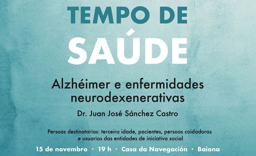 Baiona acollerá este venres 15 de novembro unha conferencia de “Tempo de saúde”, o ciclo de charlas e coloquios sobre saúde que xorden da colaboración entre a Deputación de Pontevedra e o Colexio Oficial de Médicos. A deputada provincial Olga María García, asistirá á charla, que terá lugar na Casa da Navegación ás 19:00 horas e nela o doutor Juan José Sánchez Castro abordará o tema do “Alzheimer e enfermidades neurodexenerativas”. A conferencia está dirixida ao público de maior idade, pacientes, persoas coidadoras e usuarios das entidades de iniciativa social.