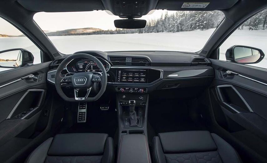 El diseño atlético de la carrocería de los RS Q3 y RS Q3 Sportback tiene su reflejo en su espacioso interior, que ha sido concebido pensando en el conductor. La unidad de control del sistema de climatización, la consola central y la pantalla del MMI touch están orientadas 10 grados hacia el conductor. El volante deportivo RS forrado en cuero y achatado en su parte inferior incluye levas de cambio de nuevo diseño y el nuevo botón "RS MODE", que permite al conductor controlar los dos modos RS en el sistema Audi drive select. La configuración específica RS se muestra automáticamente en el Audi virtual cockpit plus. Los asientos deportivos están tapizados de serie en cuero negro/Alcantara e incluyen logos RS. Se ofrece como opción una variante aún más deportiva, los asientos RS sport tapizados en Nappa fina con un patrón en panal específico RS y reposacabezas integrados.