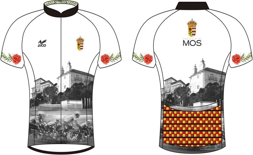 O maillot ten un deseño de fondo branco con imaxes en braco e negro do Pazo de Mos (desde onde se producirá a saída da proba ciclista), da Casa Consistorial sita en Petelos e e da nova rotonda das Angustias coa fonte luminosa co lema SOMOSMOS e un pelotón de ciclistas ao seu redor superpostas, tanto na parte frontal como na traseira da prenda deportiva. Ademais atrás, na parte dos petos traseiros, loce o xadrezado en cores vermello e amarelo característico da heráldica mosense, tanto do escudo como da bandeira oficiais municipais. A rosa de Mos e o escudo ocupan tamén lugares protagonistas no maillot oficial da saída de LA VUELTA 20 desde Mos: a rosa engalana as mangas e o escudo aparece tanto no frontal na parte superior esquerda sobre o corazón como na traseira na parte superior central da espalda. Trátase dun deseño moi simbólico e corporativo, á par que orixinal e vistoso.