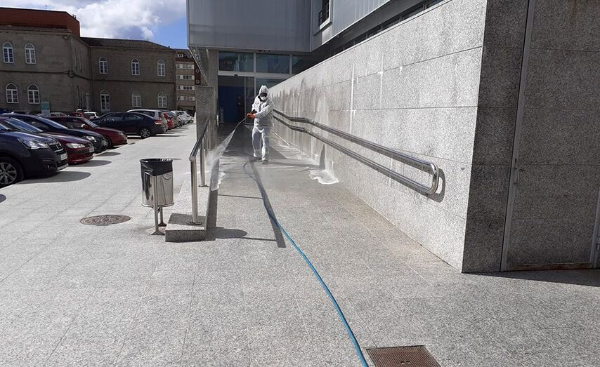 Amais persoal de obras comezou hoxe á desinfección de contedores e dos accesos a edificios públicos coma a casa do concello, a policía local, ou o centro de saúde, así coma as entradas ás farmacias. Esta operación repetirase diariamente.