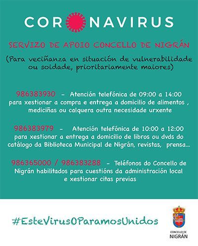 O Concello de Nigrán pon  en funcionamento un servizo de asistencia a persoas en especial risco ante o Covid-19, ou en soidade ou sen medios, co obxectivo de facilitarlles a compra de alimentos, menciñas e mesmo o préstamo de libros, revistas ou dvds da Biblioteca Municipal (instalación pechada, como todas as dependencias municipais).