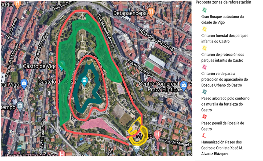 - Reforestación do Parque do Castro para convertilo nunha gran área urbana verde. Construir un “Bosque Urbano de Vigo” no que se pranten árbores autóctonas e se realice unha restauración que convirta nun parque de referencia internacional dende o punto de vista medioambiental e cultural. Un gran bosque prantado por voluntarios no que creza unha gran carballeira e os nenos poidan observar especies autóctonas coma castiñeiros, bidueiros, pradairos, freixos, sobreiras, teixos e acibos. Especies que atraerán paxaros e fauna autoctona que ven desaparecendo da cidade nas últimas décadas: pardais, paporrubios, zorzais, verderóns ou andoriñas. Especies de árbores que devolverán a pasaxe de outono ós vigueses e viguesas, como ocurre en moitas ciudades europeas. Que podamos disfrutar dos ocres, bermellos e amárelos das follas do bosque autóctono. A proposta inclué a prantación de especies frondosas de porte mediano e de folla caediza polo paseo circular pola contorna da muralla do Castelo. Por último cinturones verdes de protección dos parques de xogos infantis e áreas biosaudables e no borde sur do aparcadoiro municipal de coches.