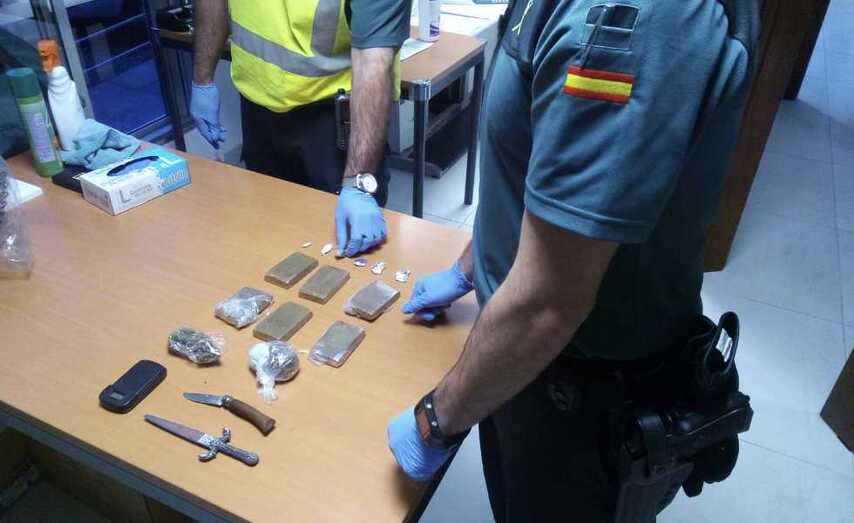 Al proceder al registro del vehículo, los efectivos de la patrulla se percataron de que las tapicerías de los asientos delanteros presentaban sendos cortes en su parte posterior y en el interior de los respaldos se encontraron con un amplio surtido de estupefacientes: más de medio kilo de hachís repartido en seis tabletas, varios envoltorios de plástico con marihuana y otras pequeñas cantidades de heroína y cocaína. Además, guardaba una báscula de precisión y una navaja, como complementos utilizados para la distribución y empaquetado de los envoltorios.