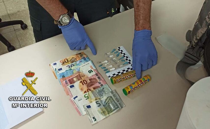 A su pareja, que fue localizado en las inmediaciones del lugar, se le intervino un envoltorio de cocaína y otro bote de golosinas, en esta ocasión vacío, idéntico al que se encontró dentro del coche y 160 euros en efectivo.