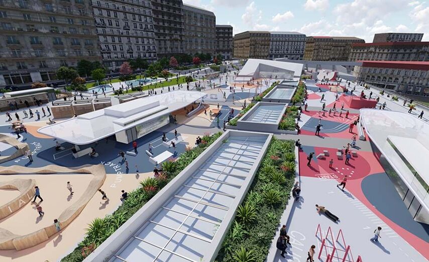 Dará la bienvenida a este espacio una llamativa entrada y el Jardín del Arte, y permitirá disfrutar desde un gran paseo algunas de las mejores vistas de la ciudad. La zona deportiva contará con pistas para la práctica de diferentes deportes, como basket 3x3, teqball, mini fútbol para adultos o un pump track orientado a niños. Tendrá también una Urban Skate Área, un skate park con gran variedad de obstáculos, un halfpipe y una pista de patinaje para niños. En la zona oeste de la azotea se levantará un espacio ajardinado perfecto para disfrutar de un momento de relax con sus áreas de pic-nic y espacio dedicado a eventos. Y, para las familias, habrá un zona con una terraza para juegos tradicionales, en la que destaca un llamativo barco que, junto con sus redes, será uno de los grandes atractivos infantiles del Vialia. Junto a esta zona se levantará el espacio Food Court, que acogerá restaurantes y terrazas de referencia.