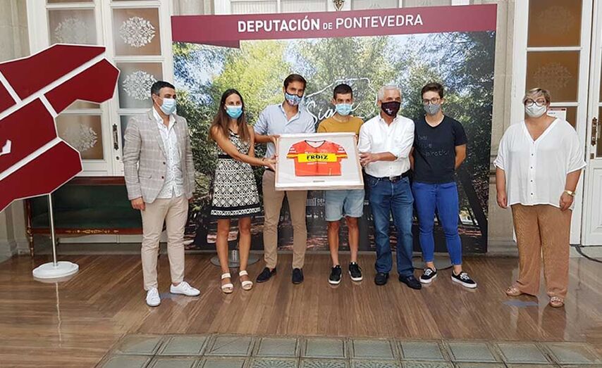 Samuel Blanco, o ciclista de Redondela que vén de proclamarse campión de España en Ruta na modalidade elite (afeccionado) durante a proba celebrada recentemente en Xaén, estivo hoxe na Deputación para entregar o maillot ao deputado de Deportes Gorka Gómez. Ao acto, no que tamén participaron os deputados Laura Iglesias, Olga García e Manuel González, asistiu ademais o director deportivo do Supermercados Froiz, Evaristo Portela, e a directora de comunicación do equipo, Ana Portela.
