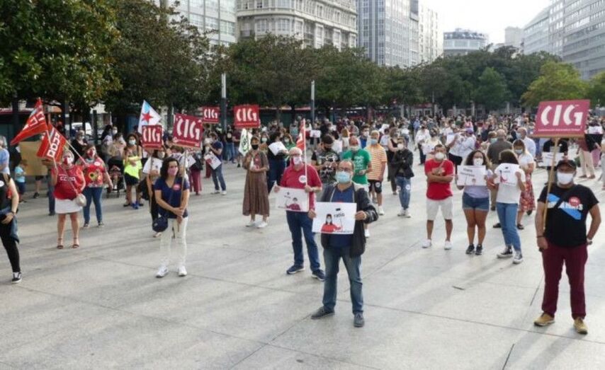 No día no que se prevía o comezo de curso en secundaria, bacharelato e FP, que tivo que ser adiado porque o caos organizativo e os bandazos dados pola Consellaría de Educación facía imposíbel a organización interna dos centros, unha ampla representación de profesorado, alumnado e familias concentrouse en 25 localidades galegas para seguir reclamando seguridade nas aulas. “Nestes momentos xa se pode ver como algún centro foi foco de contaxio e nin sequera neste aspecto está correctamente desenvolvido o protocolo da Xunta, cando levamos apenas catro días lectivos, con períodos de adaptación na etapa de infantil e inicio gradual en primaria e educación especial e xa hai 29 casos segundo os datos da propia Consellaría”, sinalou Suso Bermello, secretario nacional da CIG-Ensino na concentración da Coruña. O sindicato maioritario no sector do ensino público, xunto con CCOO, CSIF e STEG, as confederacións ANPAs galegas e CONFAPA e as organizacións estudantís ERGUER e ANEGA convocaron estes actos de protesta para incidir na falta de seguridade nas aulas coas medidas ata o momento adoptadas.