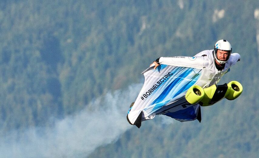 El objetivo del sistema de propulsión eléctrico es aumentar el rendimiento del traje de alas para lograr un planeo constante, lo que permite cubrir mayores distancias. Al activarse, explica Salzmann, el piloto experimenta una aceleración inmediata, lo que le permite volar a velocidades superiores a los 300 km/h. Para el vuelo inaugural con el Traje de Alas Electrificado de BMW, Salzmann voló en helicóptero junto con otros dos pilotos con traje de alas sobre las cimas de las montañas de su Austria natal. Inmediatamente después del salto, desde una altitud de 3.000 metros, los tres volaron en formación en dirección a un macizo montañoso. Con la ayuda del motor eléctrico, Salzmann aceleró más rápido que sus compañeros y fue capaz de volar a través de la cima en un vuelo empinado. Tras volar una vuelta más, se encontró con los otros dos pilotos que habían planeado alrededor de la montaña. Los tres pilotos con traje de alas finalmente abrieron sus paracaídas y aterrizaron en el destino acordado.