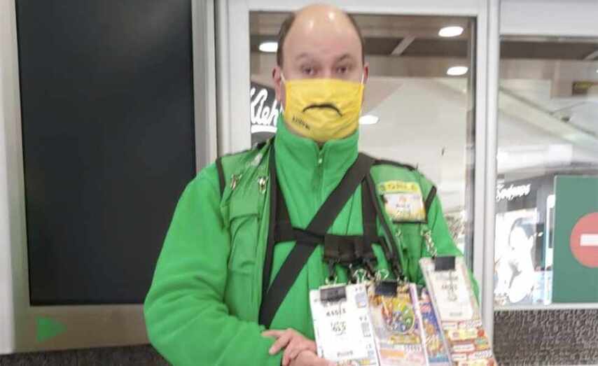 El vendedor de la ONCE Alberto Fernández Calvo es quien ha llevado la suerte de la ONCE a algunos de sus clientes habituales desde su punto de venta en el número 25 de la Gran Vía, en la puerta de El Corte Inglés esquina a calle Ecuador. A primera hora ya había recibido la visita de cuatro clientes agraciados, todas personas mayores.
