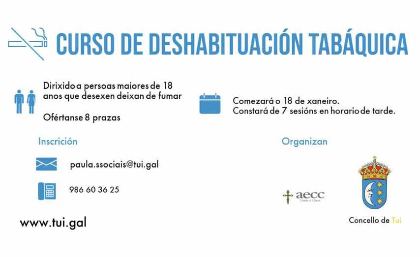 O departamento de Prevención de Drogodependencias do Concello de Tui, en colaboración coa Asociación Española Contra o Cancro, un curso de Deshabituación Tabáquica.