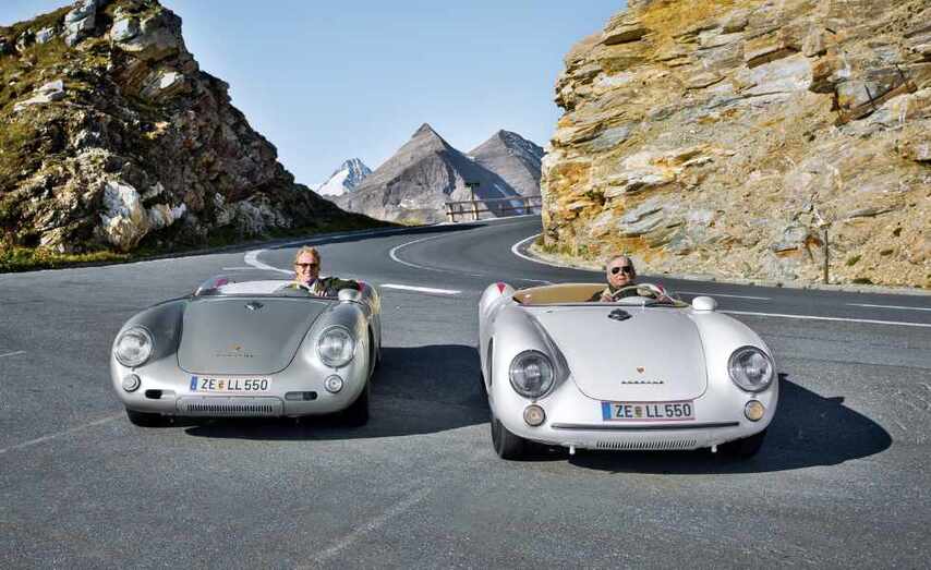 Parada de descanso en el restaurante Fuschertörl, a 2.407 metros de altitud. Cuando los dos pilotos se quitan los gorros de lana que llevan para protegerse del viento gélido, asistimos a un suceso singular: al volante de los Porsche hay dos Porsche, Wolfgang y Ferdinand, padre e hijo. Nunca antes habían circulado juntos con dos 550 por la carretera alpina del Grossglockner, a pesar de ser un recorrido muy vinculado a la familia.